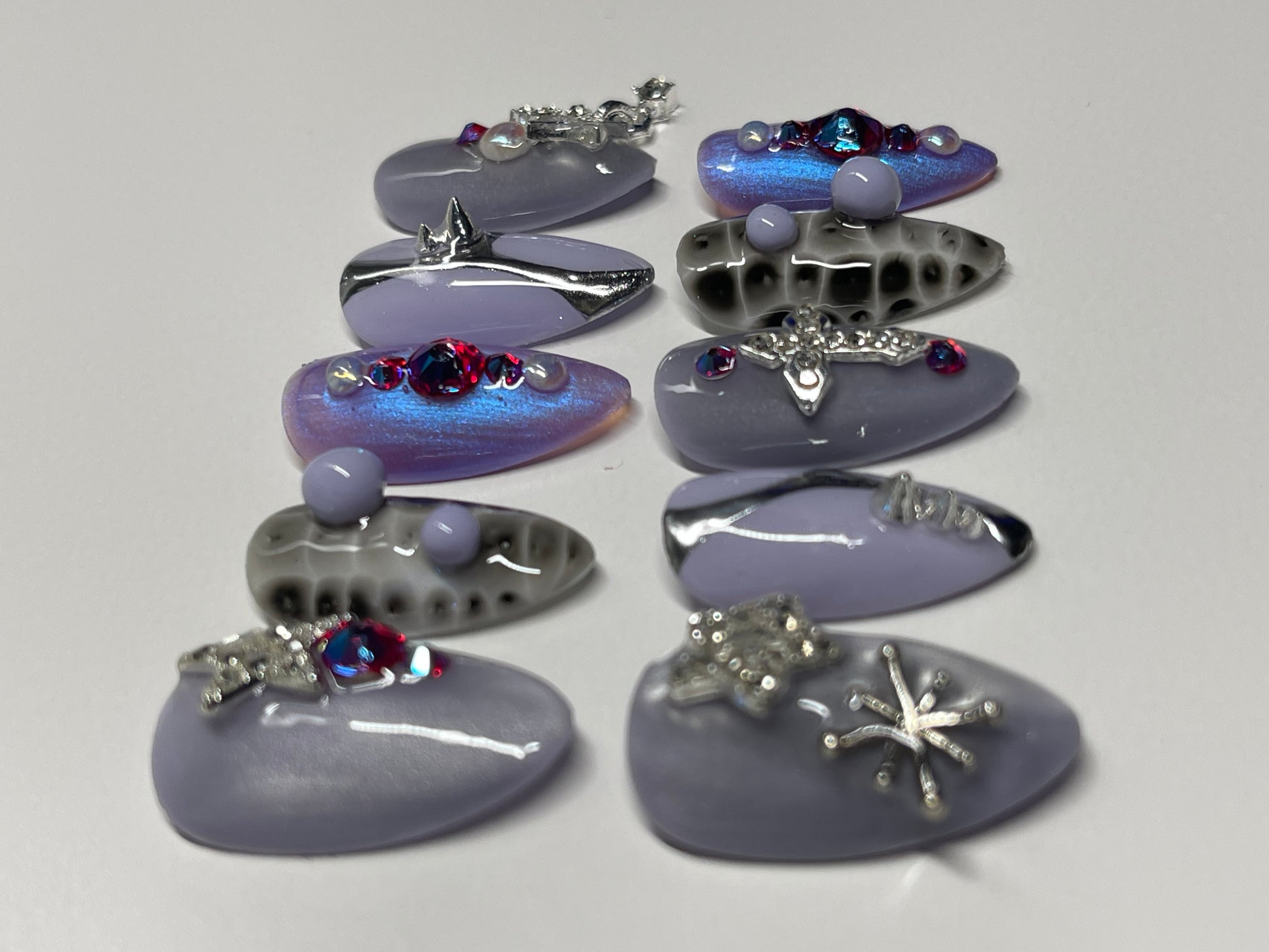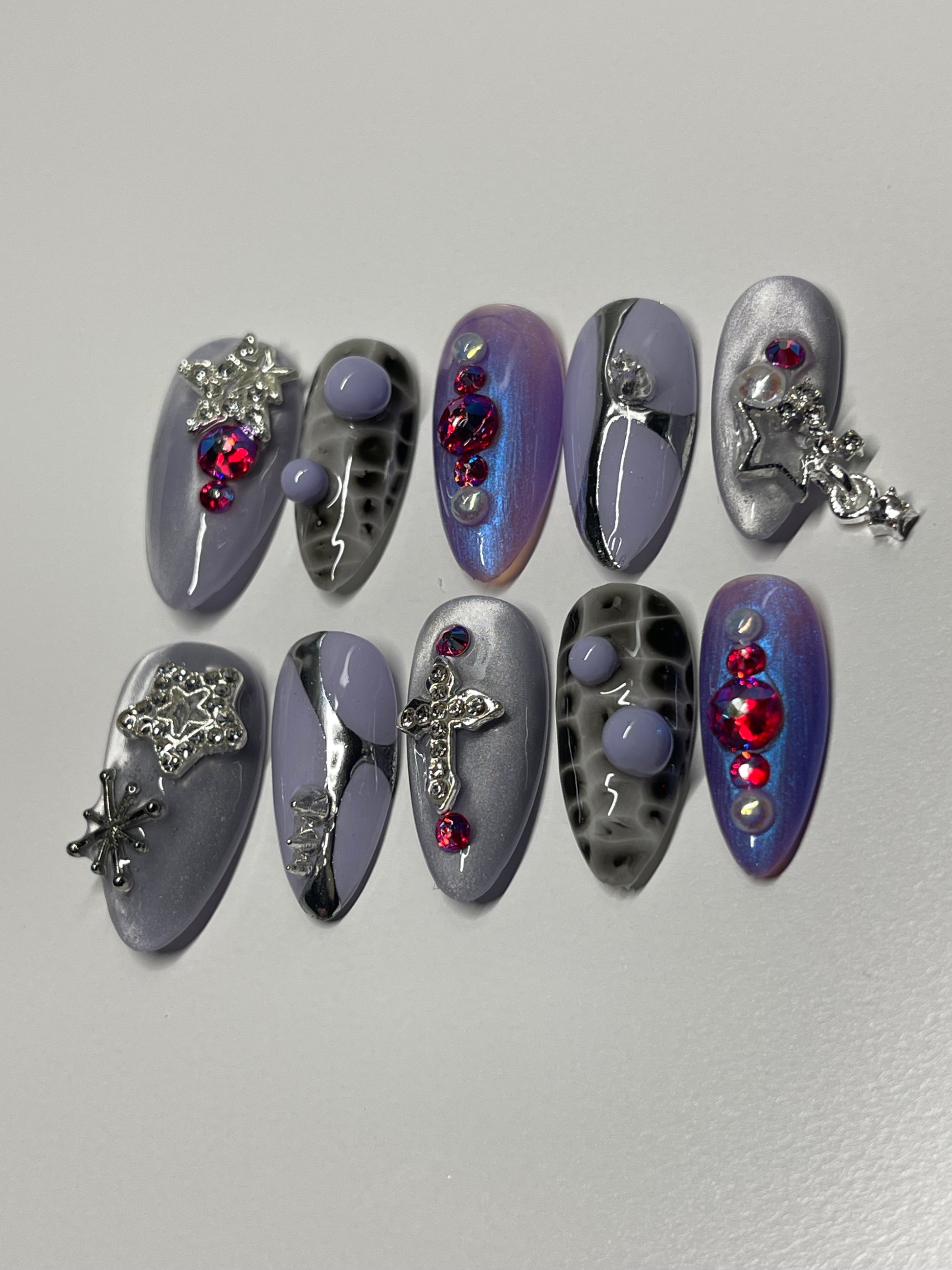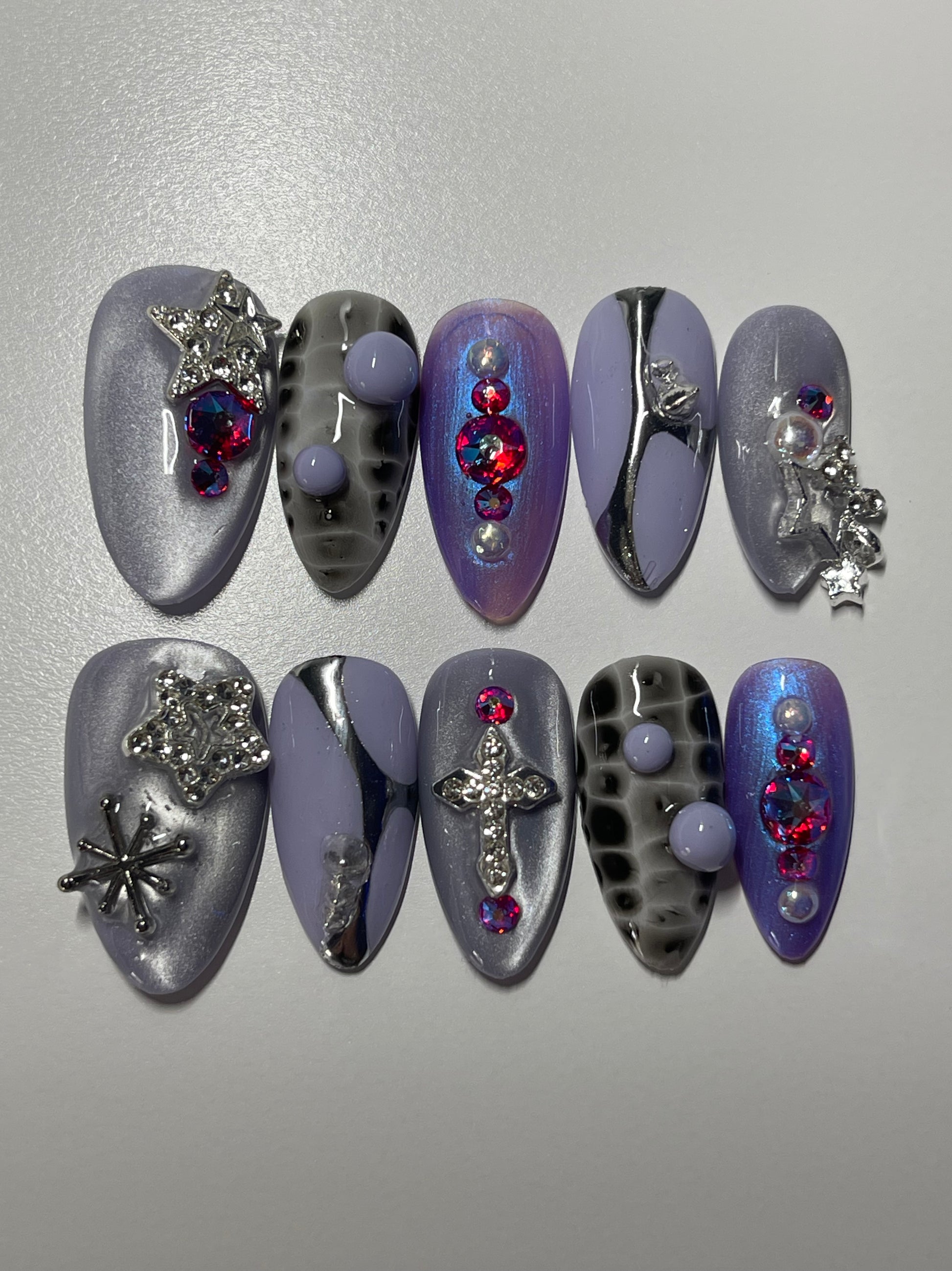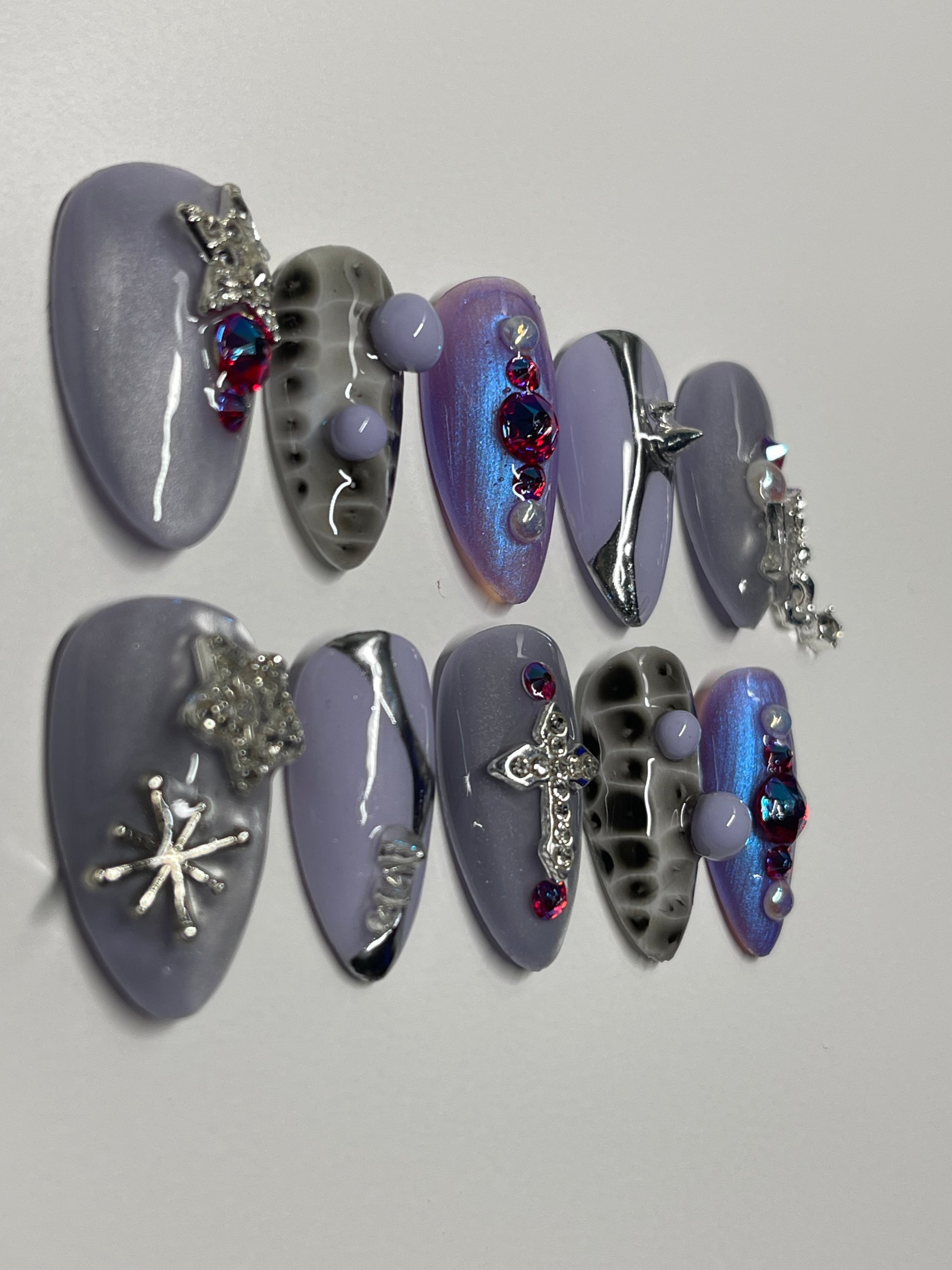 Step into the spotlight with a mesmerizing blend of soft lilac polish, high-shine chrome, and dazzling cat-eye effects that shift with every movement. Adorned with delicate silver embellishments, these press-on nails strike the perfect balance between dreamy romance and modern edge. Whether you're heading to a special event or just want to elevate your everyday look, these nails deliver instant sophistication.
