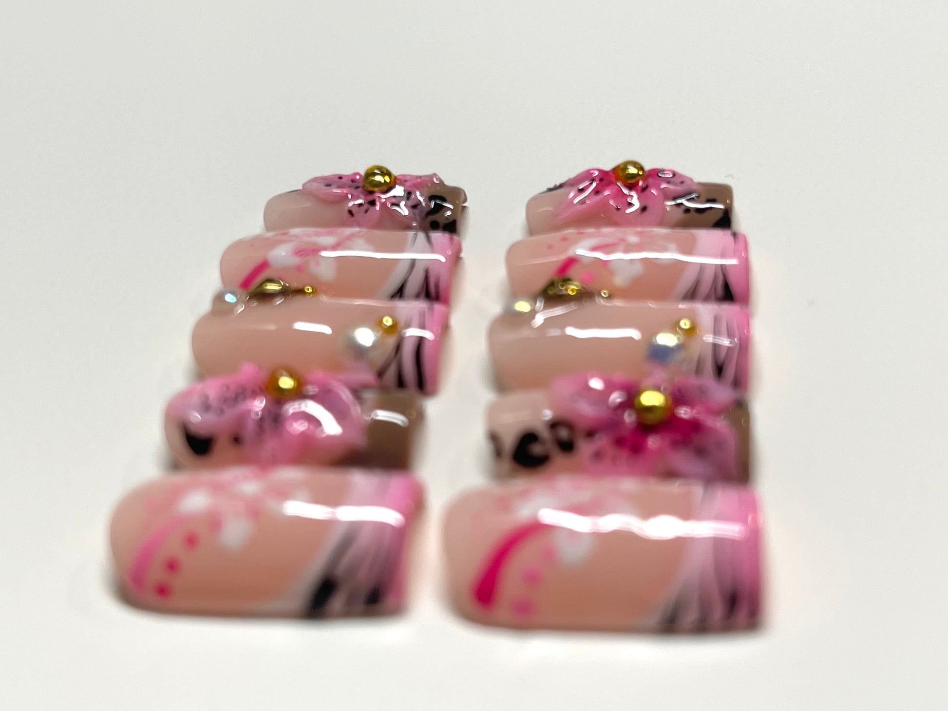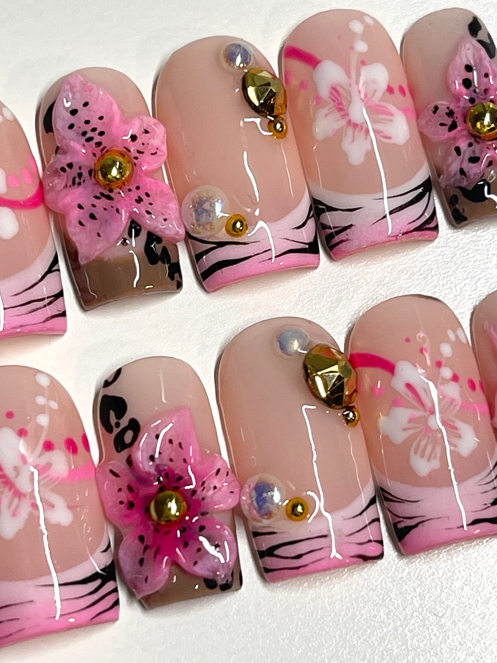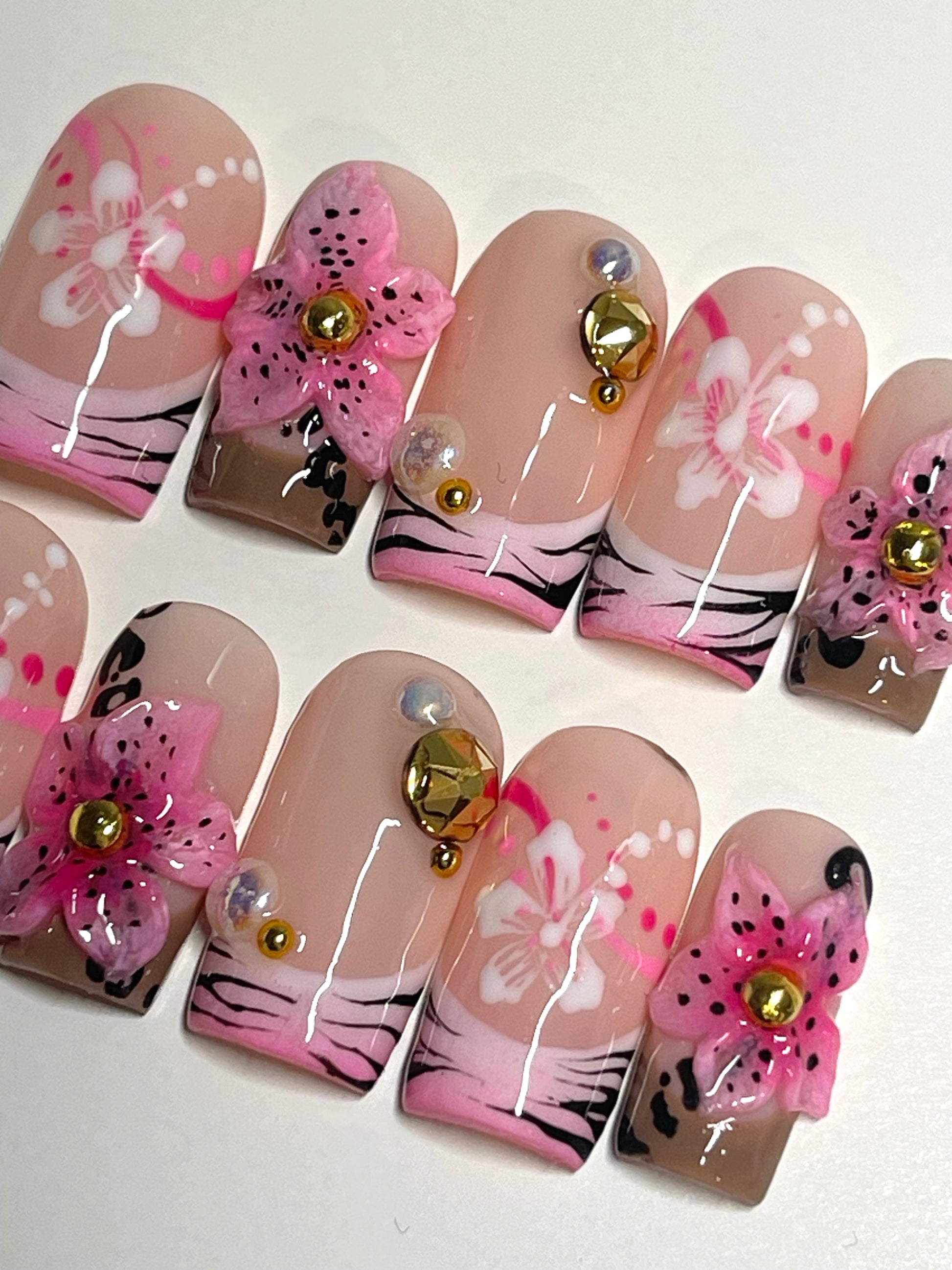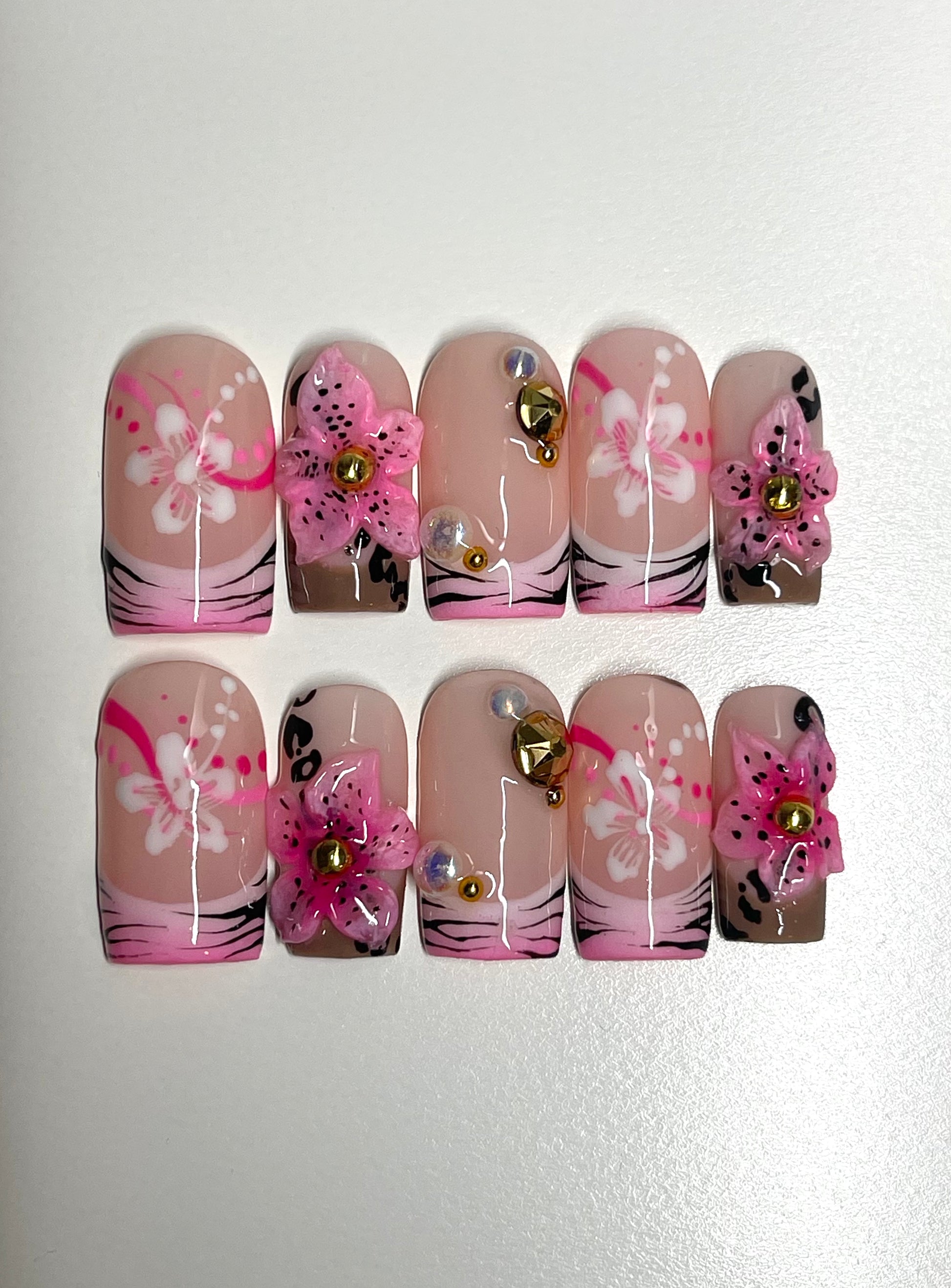 Elevate your nail game with our stunning Y2K-inspired press on nails featuring french tips with ombre, vibrant hibiscus flowers, and luxurious 3D gel florals. Each set is enhanced with airbrush detailing and bold cheetah & zebra prints for a fierce, trendy look. Perfect for a quick, salon-quality manicure with maximum glam!