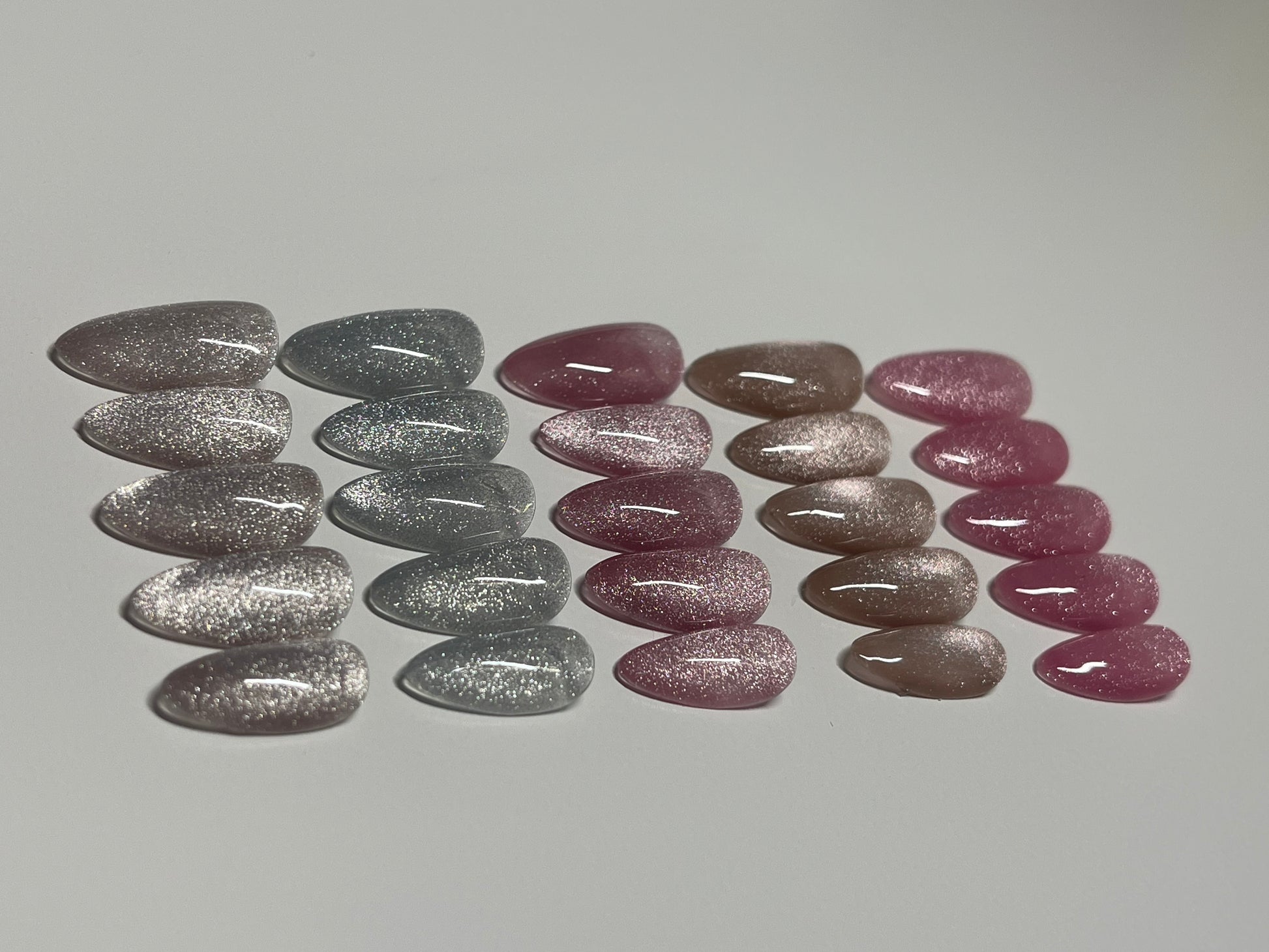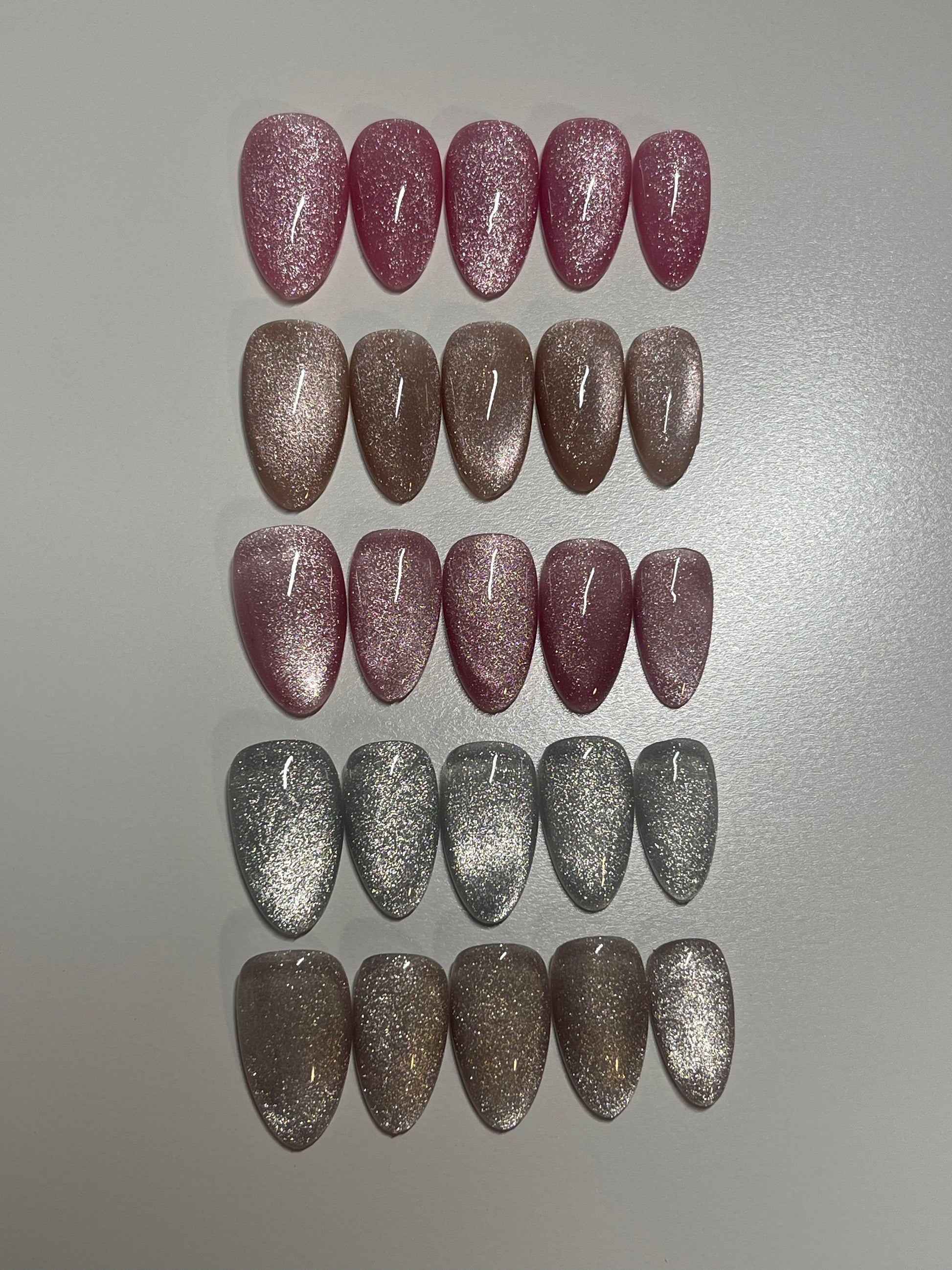 Designed for the modern minimalist who craves understated glam, these press-ons combine soft, neutral tones with the mesmerizing shimmer of cat eye gel polish for a subtle yet captivating finish. Each set features a curated range of beige, taupe, soft blush, and creamy nude hues, enhanced with a magnetic cat eye effect that catches the light with every movement. Whether you're heading to a meeting or a night out, these nails offer salon-quality beauty without the wait or damage.
